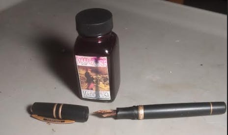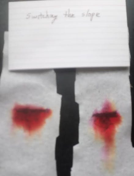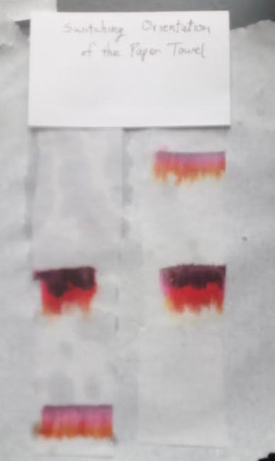 Through an ink accident, I noticed that my Noodlers RedBlack ink wicked very strangely through a wet paper towel. Seems my favorite ink is made of several different pigments - cool. The ink split into several colors, and the yellows went furthest, the light reds less far, the deep reds hardly at all, and only in one direction.